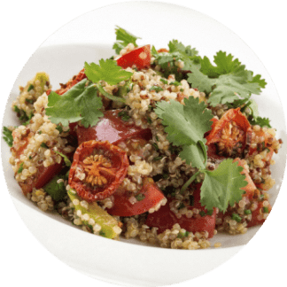 One cup quinoa with sun-dried tomatoes, olives,