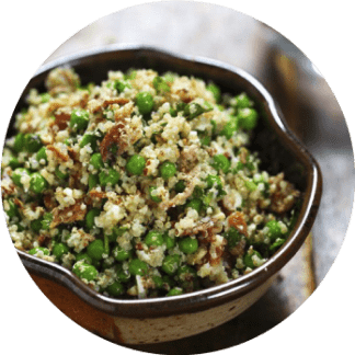 Baked cod and bulgur with green peas;