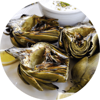 One artichoke (cooked) with garlic powder, olive oil and salt (add another artichoke if you want to increase the calories);