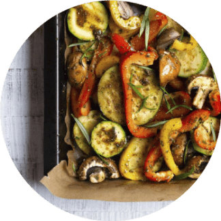 Oven-baked vegetables: potatoes, artichokes, tomatoes, carrots, eggplant, and zucchini.