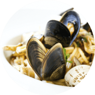 Pasta with seafood: mussels, shrimp, squid meat.