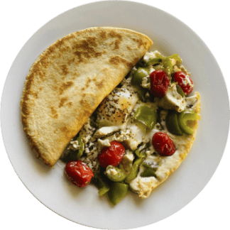 Two egg omelet with onions, tomatoes, and bell peppers.